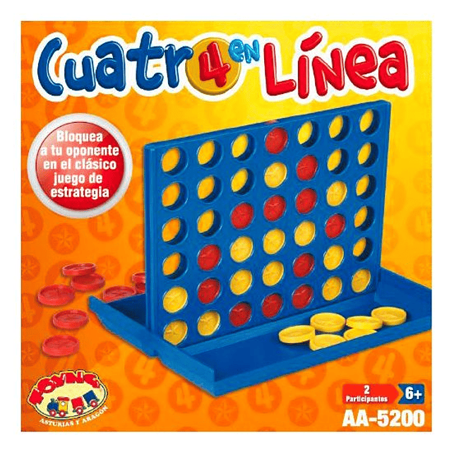 Código: AA-5200Edad: 6 años +Bloquea a tu oponente en el clásico juego de estrategia. El objetivo del juego es formar una fila de 4 fichas del mismo color ya sea de forma horizontal, vertical o diagonal. El juego consta de 1 tablero plástico de 25.5cm de largo por 19cm de ancho por 20cm de alto y 44 fichas redondas de plástico de 3cm de diámetro en dos colores: rojas y amarillas (22 fichas por color). Cantidad de jugadores: 2 participantes. La caja mide 28*28*4cm.
